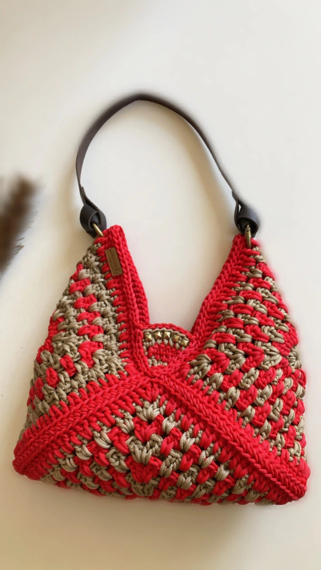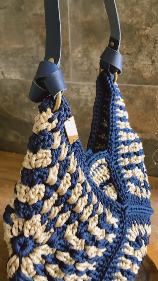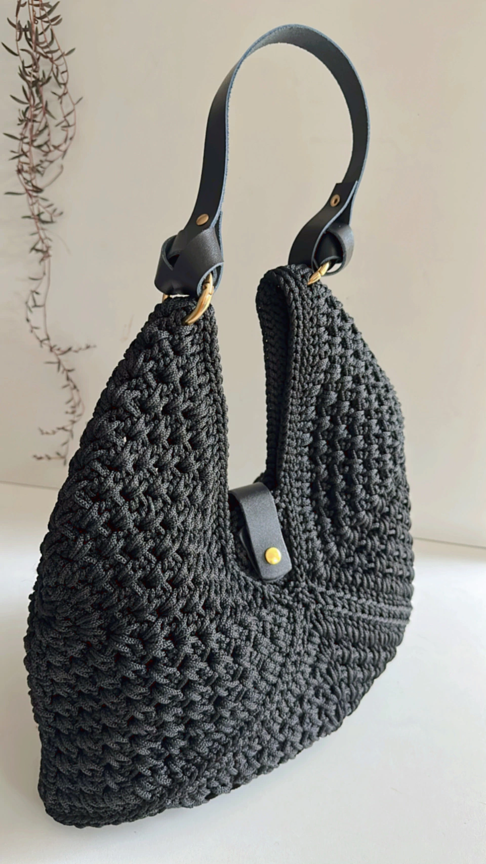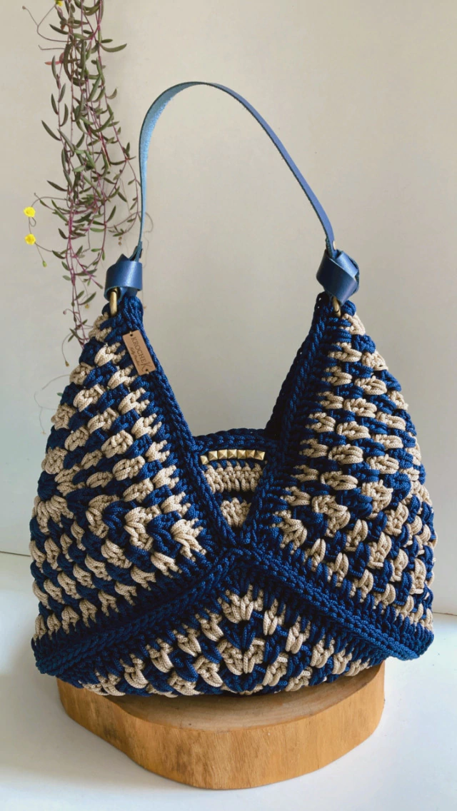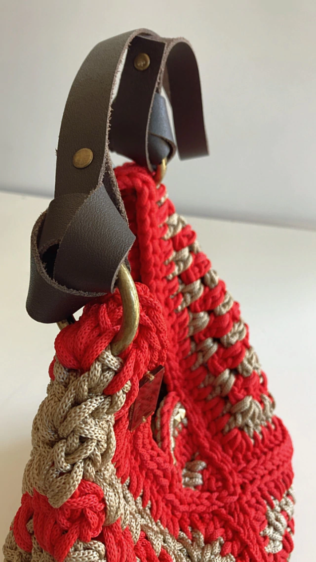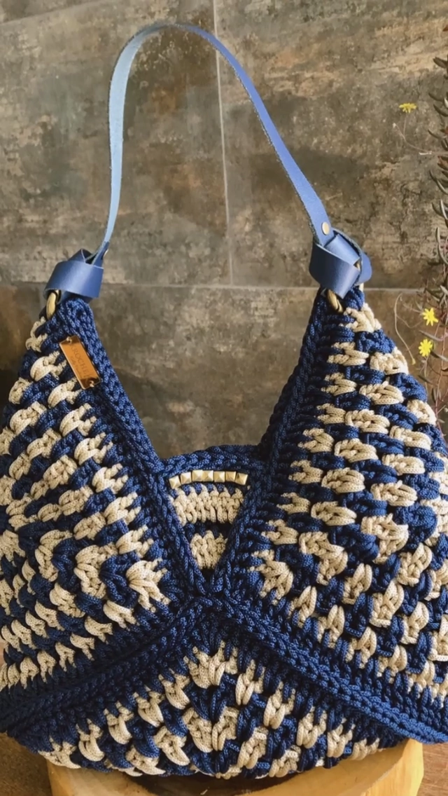 Produzida em fio náutico, alça em couro com amarração, detalhes em tachas de metal na frente.